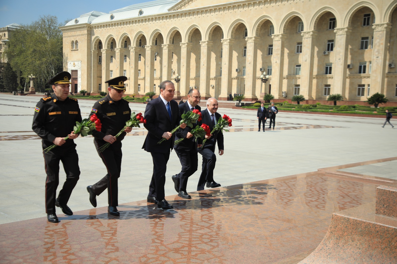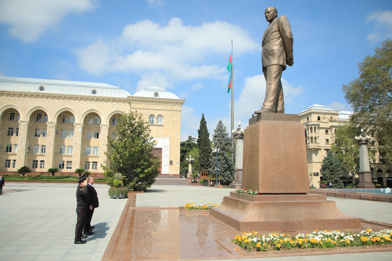 Əvvəlcə rəsmilər şəhərin Baş meydanında yerləşən Ulu Öndər Heydər Əliyevin abidəsini ziyarət edərək önünə gül dəstələri düzüblər.